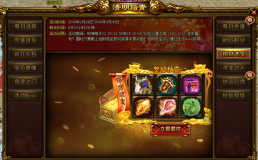 活动内容:活动期间,财神每天12:20-12:50和18:20-18:50在沙漠土城(143,123)派发福利!届时只要献上招财进宝即可活儿丰厚奖励!招财进宝可以通过击杀bOSS获得。