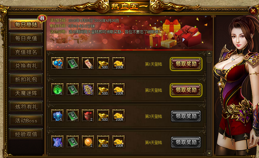 活动内容:活动期间,每天登陆即可领取丰厚奖励。不要忘记领取哦!
