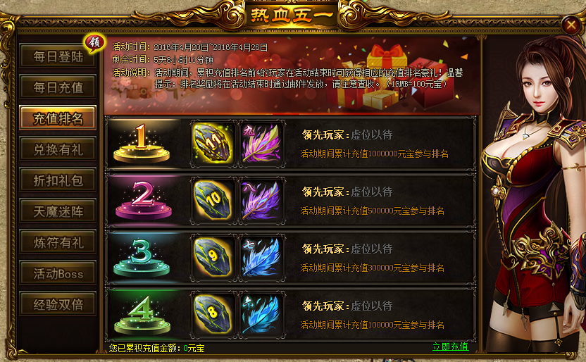 活动内容:活动期间,累计充值排名前4的玩家在活动结束时可获得相应的充值排名豪礼!温馨提示:排名奖励将在活动结束时通过邮件发放!