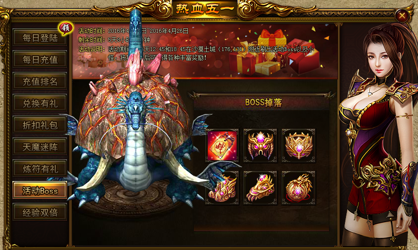 活动内容:活动期间每天12:45和18:45在沙漠土城(176,131)处刷新出活动BOSS以及小怪,将有几率获得各种丰富奖励!