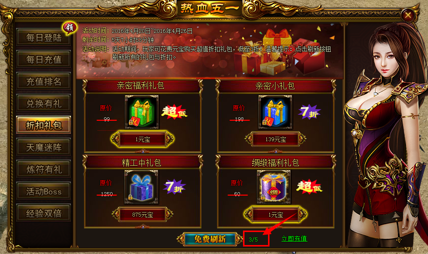 活动内容:活动期间,可花费少量元宝购买超值折扣礼包,每天可进行5次刷新,可刷新当前可购买的礼包。