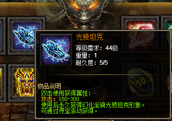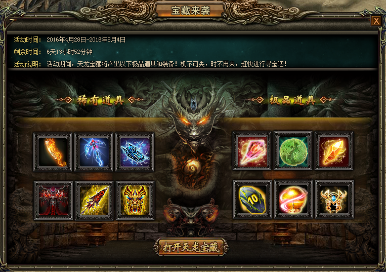 活动内容:活动期间,天龙宝藏进行寻宝将有几率获得全新幻化坐骑—光棱坦克以及战天圣龙刀(幻武)、亡灵追魂(幻武)以及战天传奇套装部件等。机不可失,时不再来!