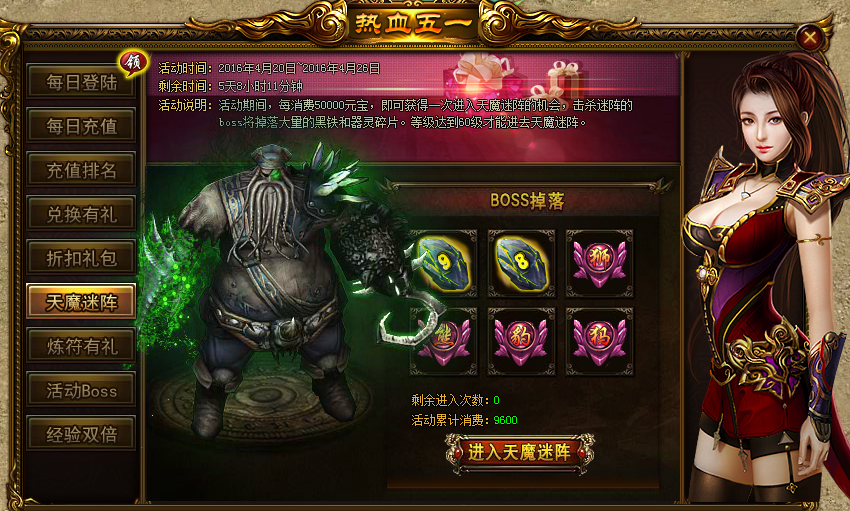 活动内容:活动期间,每消费50000元宝,即可获得一次进入天魔迷阵的机会,击杀迷阵的BOSS将掉落大量的黑铁以及器灵碎片。