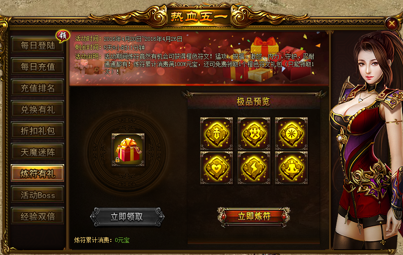 活动内容:活动期间,炼符有机会可获得橙色符文!猛攻、祝福、激怒、内力、守护、忍耐统统都有!炼符累计消费100W元宝,还可免费领取1个橙色符文礼包。