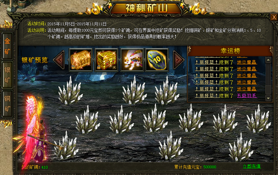 【活动内容】:活动期间,每提取1000元宝即可获得1个矿锄,在界面内挖矿可获得奖励!挖掘1次铜矿、银矿、和金矿分别消耗1、5、10个矿锄,越高级的矿堆可挖出的奖励越丰富,获得极品道具的几率也越大!