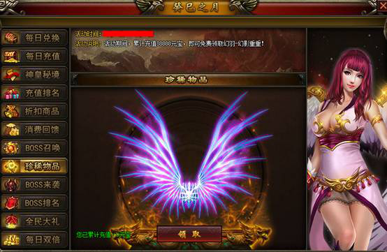 【活动说明】:活动期间,累积充值金额达到88888元宝,即可免费领取幻羽 - 幻影重重!