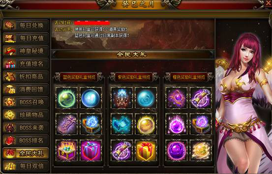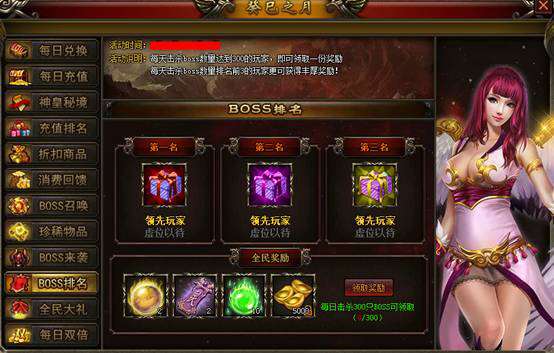 【活动说明】:每天击杀boss数量达到300的玩家,即可领取一份奖励每天击杀boss数量排名前3的玩家更可获得丰厚奖励!