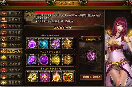 【活动说明】:活动期间,可花费1888元宝购买至尊boss召唤令,击杀掉落大量宝物,有几率掉落主宰召唤令!末日召唤令,更有机会获得星魂,珍品礼盒!