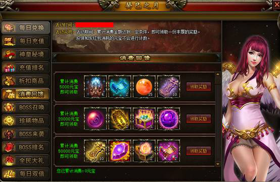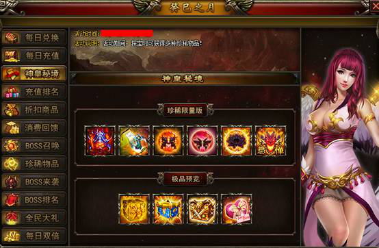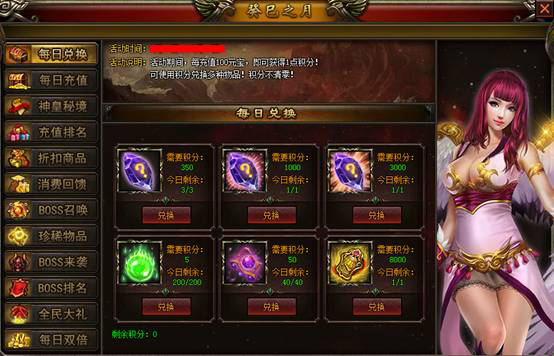 【活动说明】:活动期间,每充值100元宝,即可获得1点积分!可使用积分兑换多种物品!积分不清零!