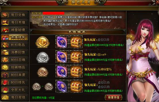 【活动说明】:活动期间,本服累计充值排名前5名便可获得丰厚奖励!排名第1更可获得11级黑水晶的奖励!累积充值100000元宝即可参与排名!活动结束后,奖励通过邮件发放!