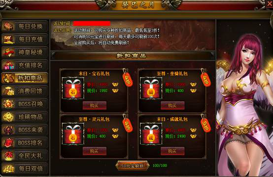 【活动说明】:活动期间,可购买多种折扣商品,全场最低低至4折!可消耗50元宝进行刷新,每天最多可刷新100次!全部购买后,将自动免费刷新!