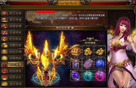 【活动说明】:活动期间,每天14:00将在沙城刷新一只boss!击杀后必定掉落高级装备宝箱和大量非绑元宝,还有万妖幡碎片,蓝色礼盒,紫色礼盒等大量奖励