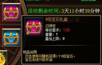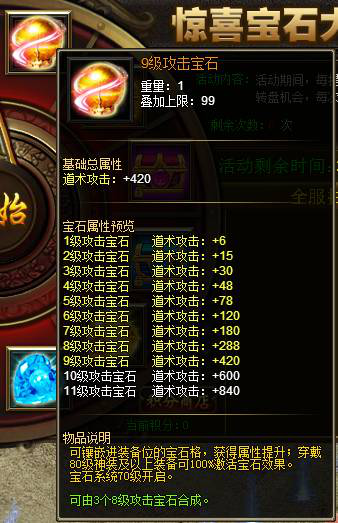 【活动内容】:活动期间,每提取5000元宝可获得1次抽奖机会,百分百中奖!可获得9级攻击宝石、8级宝石礼盒等大量奖励哦!