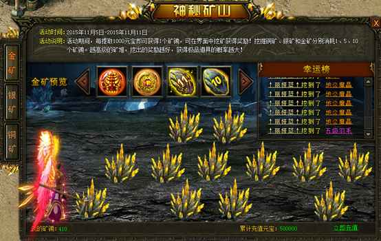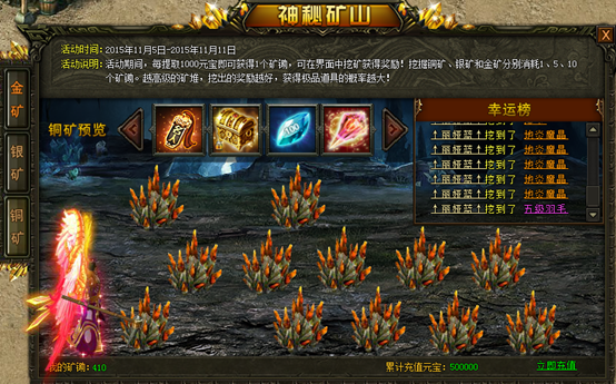 【活动内容】:活动期间,每提取1000元宝即可获得1个矿锄,在界面内挖矿可获得奖励!挖掘1次铜矿、银矿、和金矿分别消耗1、5、10个矿锄,越高级的矿堆可挖出的奖励越丰富,获得极品道具的几率也越大!