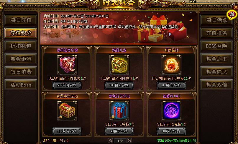 活动期间,每充值100元宝即可获得1点充值积分,积分可用来兑换超值奖励!