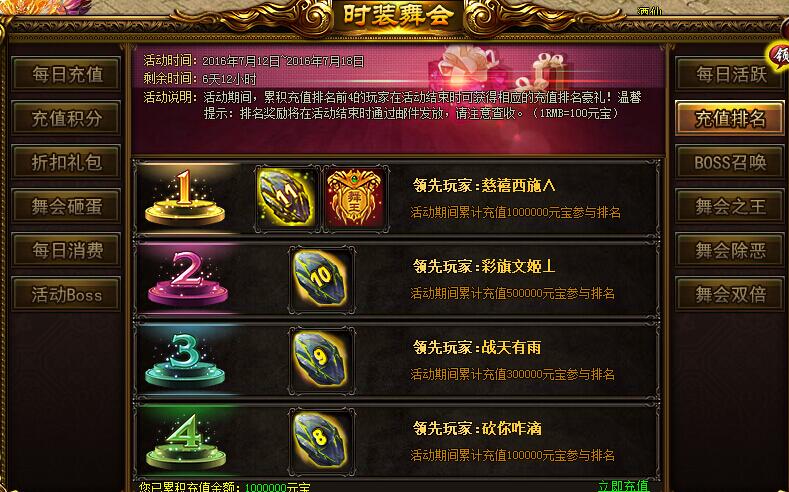 活动期间,累计充值排名前4的玩家在活动结束时可获得相应的充值排名豪礼!温馨提示:排名奖励将