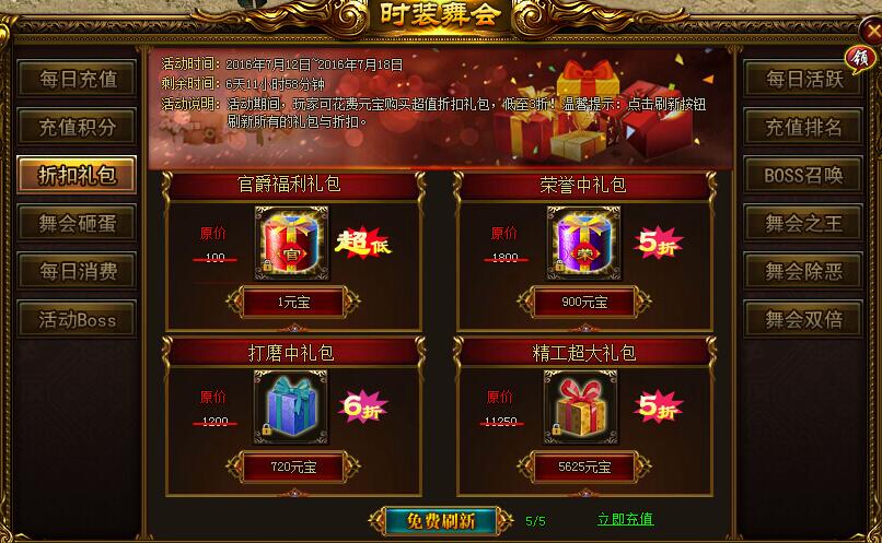 活动期间,玩家可花费元宝购买超值折扣礼包,低至3折!温馨提示:点击刷新按钮,刷新所有礼包与折扣