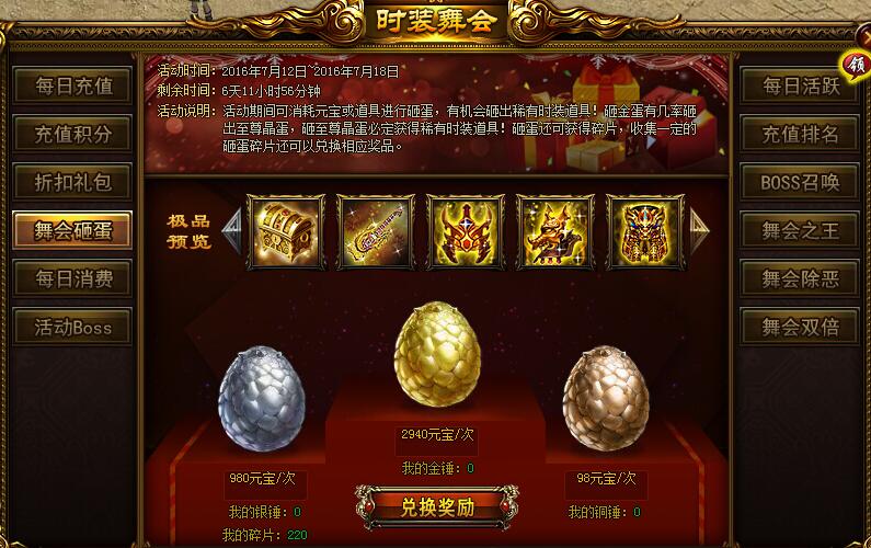 活动期间,可消耗元宝或道具进行砸蛋,有机会砸出稀有时装道具!砸金蛋有机会砸出至尊晶蛋,