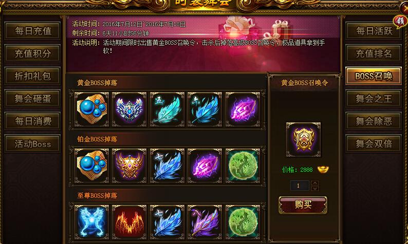 活动期间限时出售黄金Boss召唤令,击杀后掉落高级Boss召唤令,极品道具拿到手软