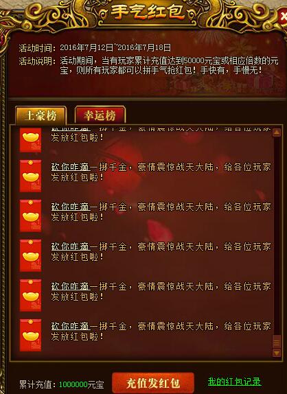 活动期间,当有玩家累计充值达到50000元宝或相应倍数的元宝,则所有玩家