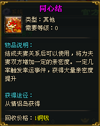 通关情侣副本,玩家可以获得大量经验和亲密度,玩家还可以获得“同心结”道具,增加情侣亲密度,打开还有几率触发全屏花雨效果。
