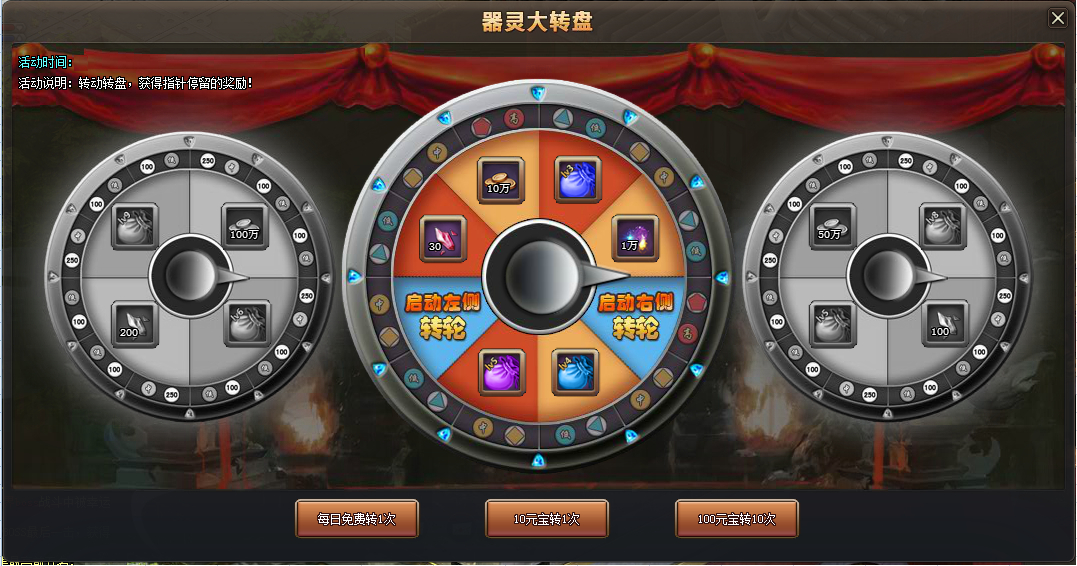 Ø10元宝转动1次转盘,获得指针停留位置的相应奖励。