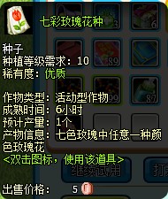 得到花种后~玩家可以在自己的庄园内种植七彩玫瑰花种,成熟时间为6小时。七彩玫瑰在接近成熟阶段时会显示出颜色。