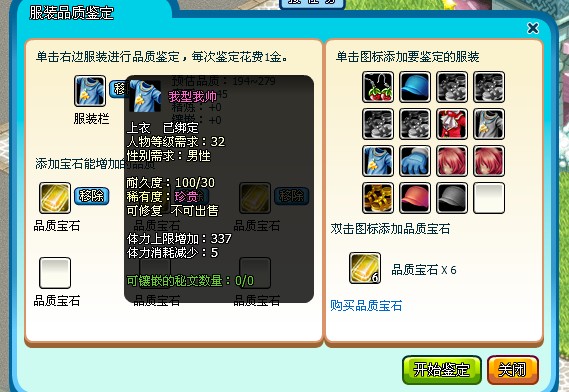 1、对于目前已经拥有的服装,包括通过活动、幸运增产剂等方式获得的服装,可以到npc“服装店老板娘”处用“品质宝石”进行品质鉴定。通过品质鉴定,服装将获得独有的服装品质,如果对当前的品质值不满意,可以通过多次鉴定来刷新服装品质。如下图:
