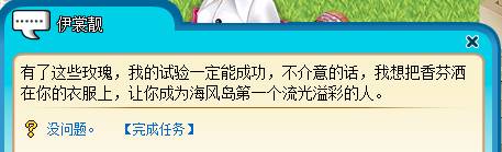 与神玛岛的通航指日可待,为了能更好的和神玛岛居民建立友好关系,镇长决定在起航前准备一份厚礼送给神玛岛居民。这份礼物将由全海风岛居民一起努力收集成,这份礼物就是2012瓶 玫瑰精华。玫瑰精华是七彩玫瑰的结晶,据说在神玛岛,是制作各种香水的必备材料,据说只有精心照顾的七彩玫瑰才会产出,神玛岛居民对这样一份礼物非常喜 欢,表示将会在收到礼物之后把制作神奇香水的秘方教给海风岛的居民,还表示,对送出玫瑰精华最多的海风岛居民将会赠与特殊的头衔奖励。