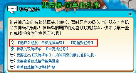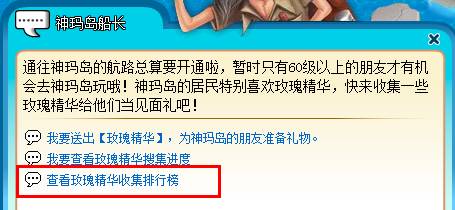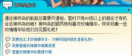 3)送出玫瑰精华的同时,还可以帮全服累计玫瑰精华搜集进度(启航进度),当进度达到2012时,神玛岛船长就会开启去往神玛岛的航线,达到60级的海风岛居民就可以去拜访神玛岛了。