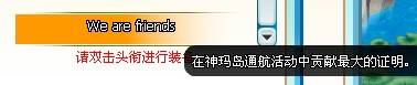 2)当玫瑰精华搜集进度达到2012时,也就是神玛岛航线开启时,每个服排行榜的第一名玩家就可以获得神玛岛送出的特别礼物——头衔“We are friends”。