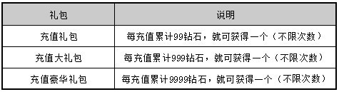 期间充值每达到一定额度,就可以获得各种诱人礼包。